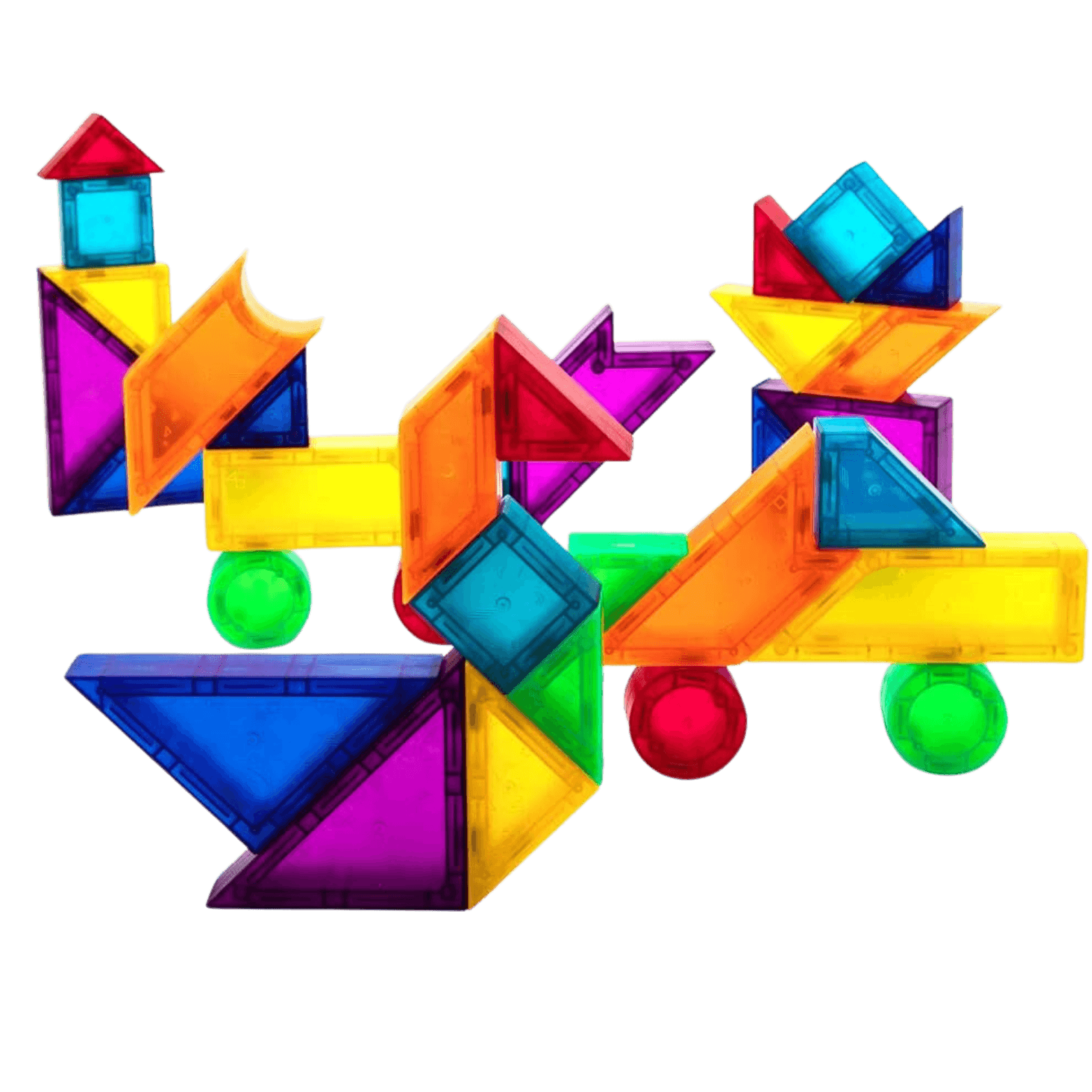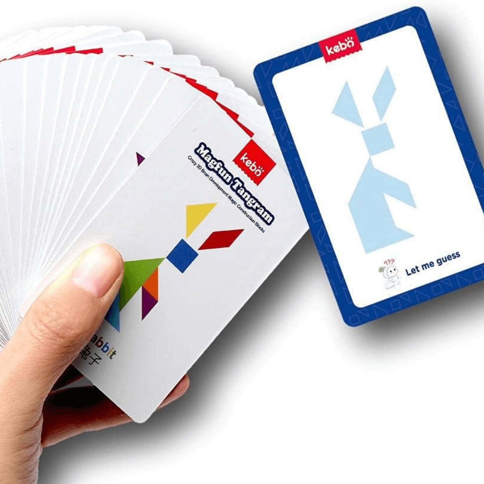 Versión innovadora del Tangram con 14 piezas magnéticas, las 7 clásicas + 7 de nuevas formas, en volumen 3D de vivos colores y formas más complejas, que se unen para hacer construcciones curiosas.