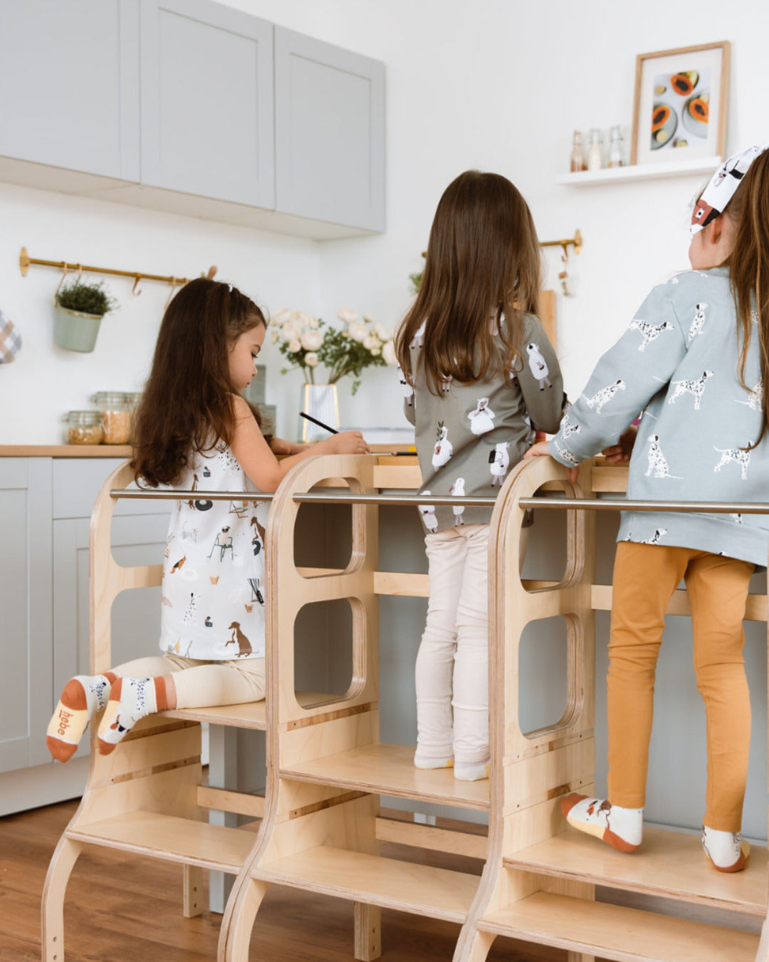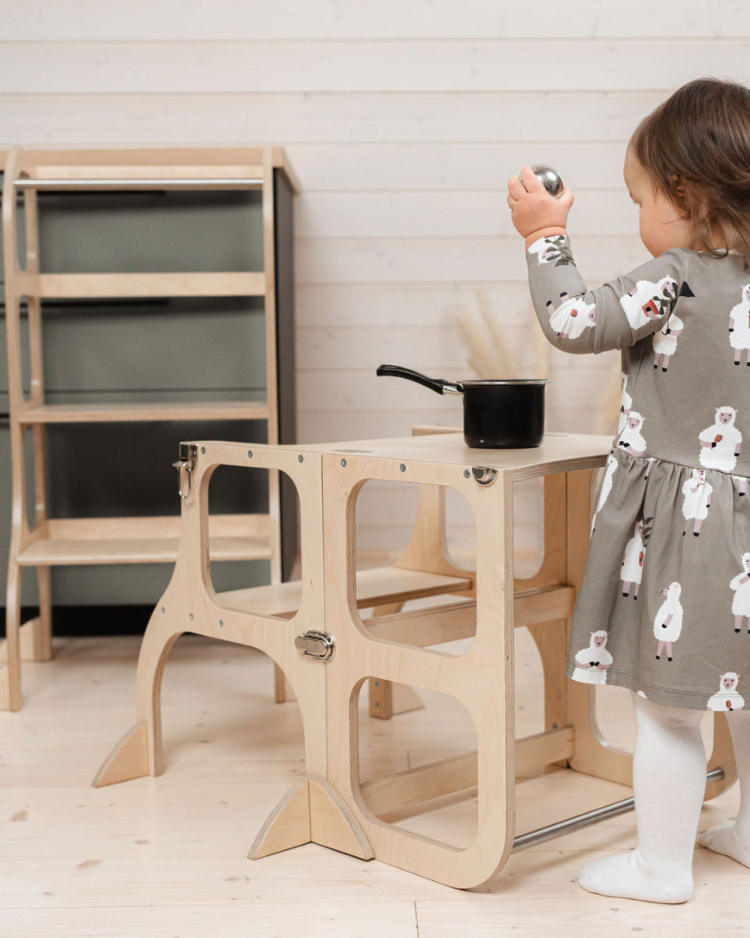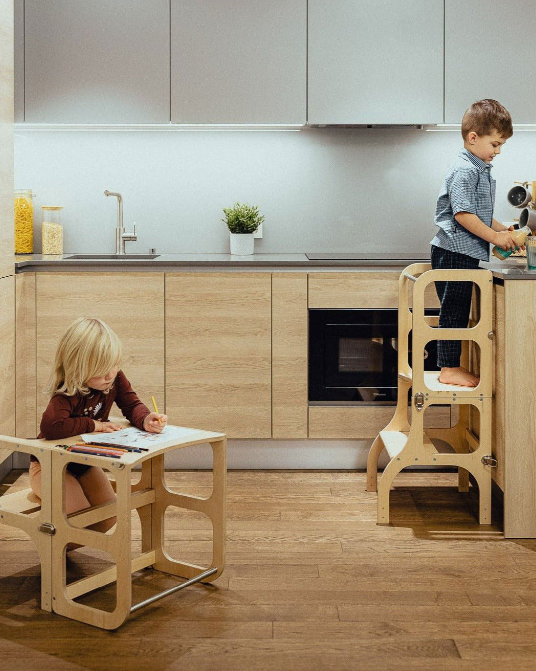Esta torre de aprendizaje ayuda a que los niños alcancen superficies más altas, como la encimera de la cocina. Además, se puede transformar fácilmente en una pequeña silla con una mesa para jugar, dibujar y hacer otras actividades.
