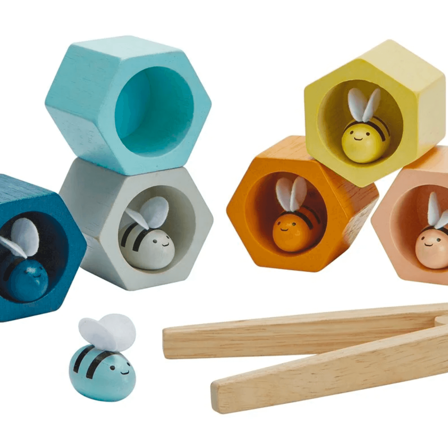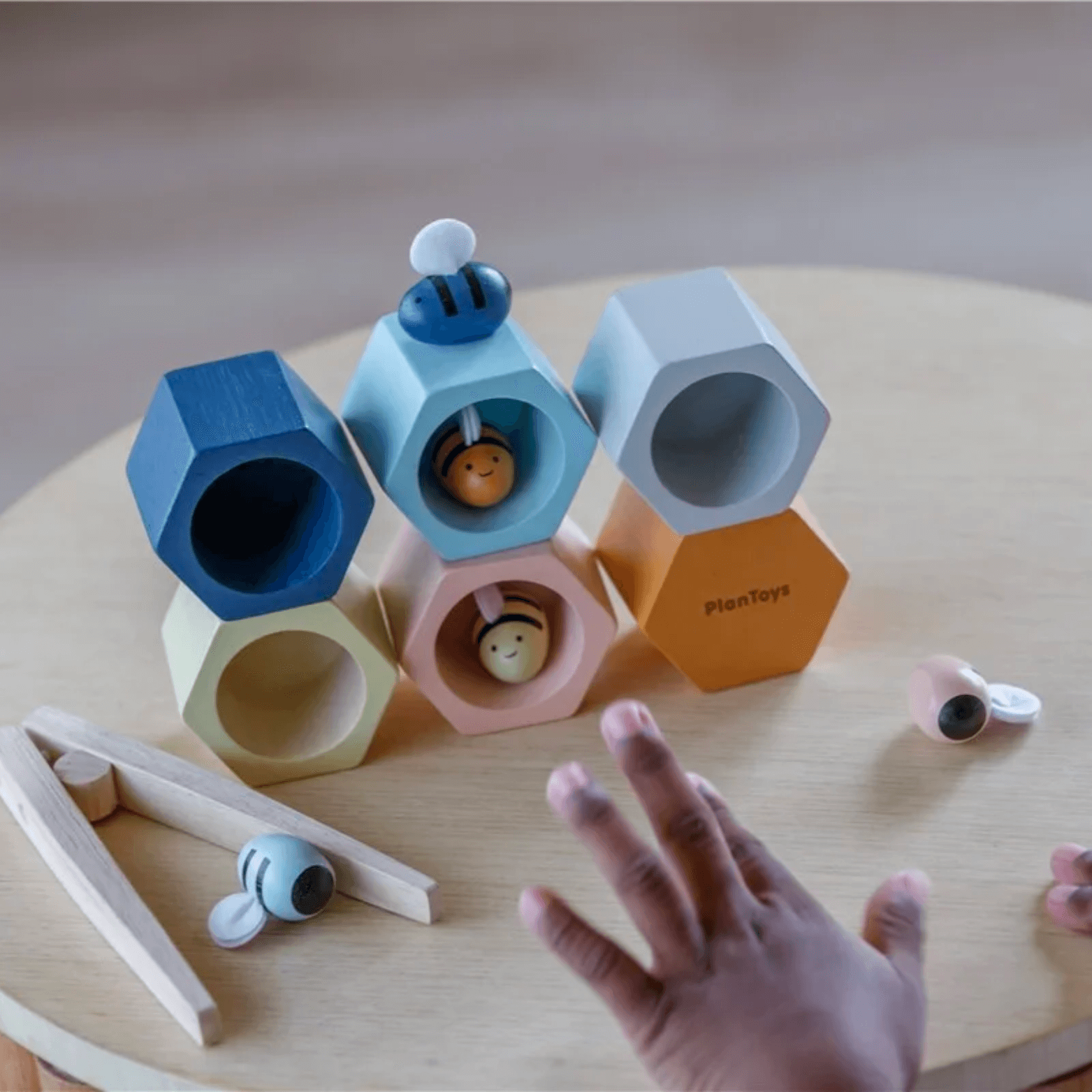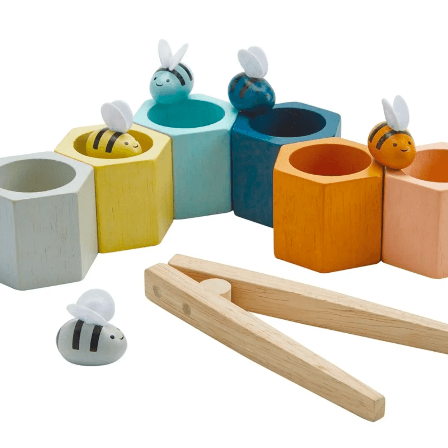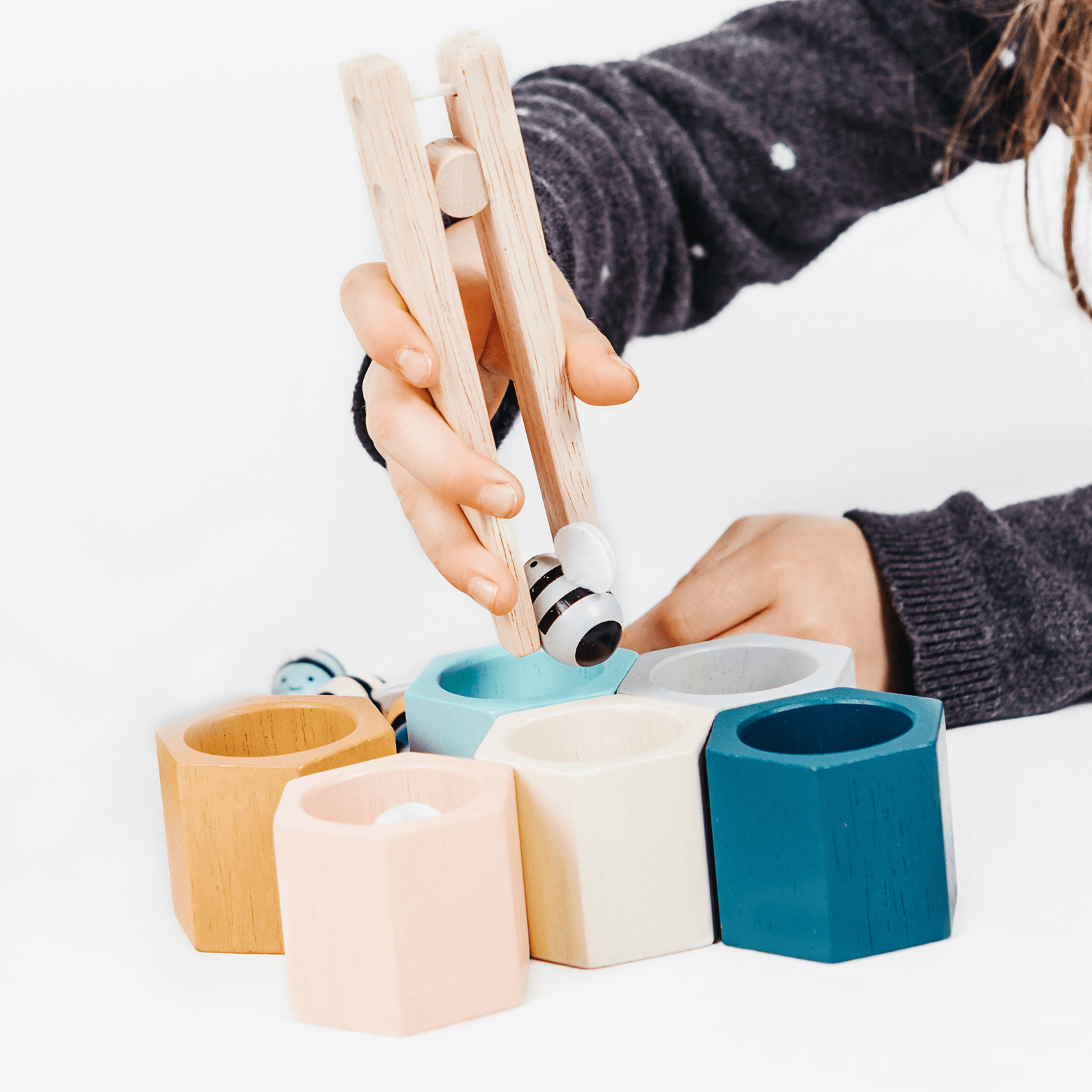Fomenta el desarrollo de habilidades motoras finas y cognitivas usando las pinzas para agarrar y clasificar las abejas, empareja cada abeja con su colmena correspondiente y aprende sobre las especies de abejas durante el tiempo libre.