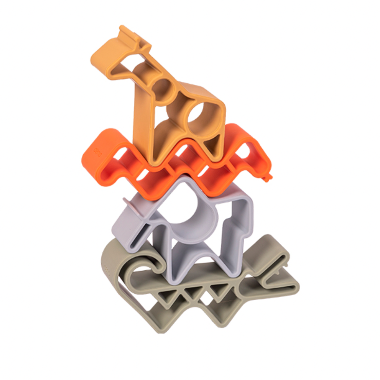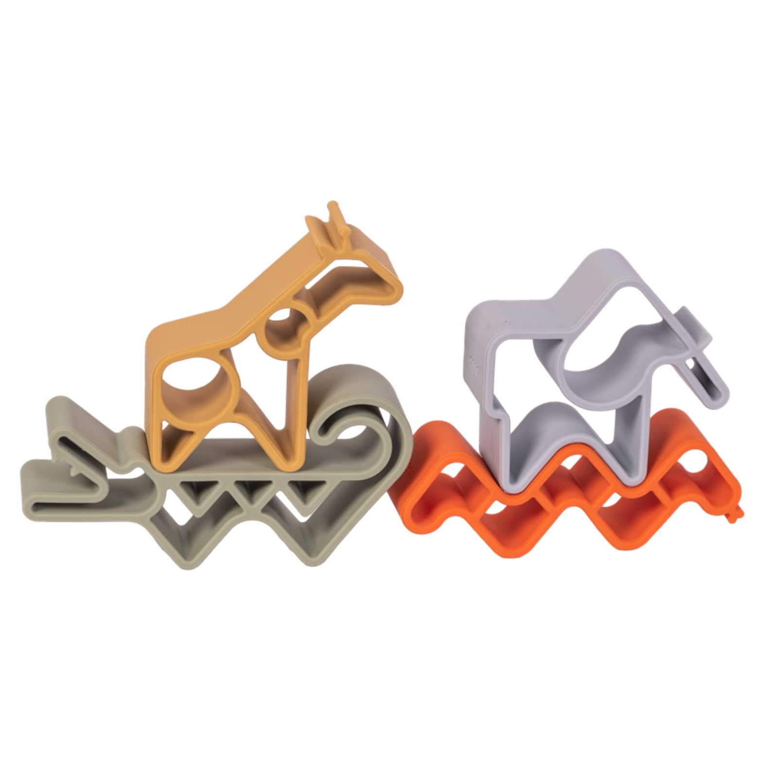 Jirafa, Elefante, Cocodrilo y Serpiente nos introducen en el maravilloso reino animal y nos ofrecen un sinfín de posibilidades de juego, desde un mordedor hasta un elemento de construcción o un molde para hornear.
