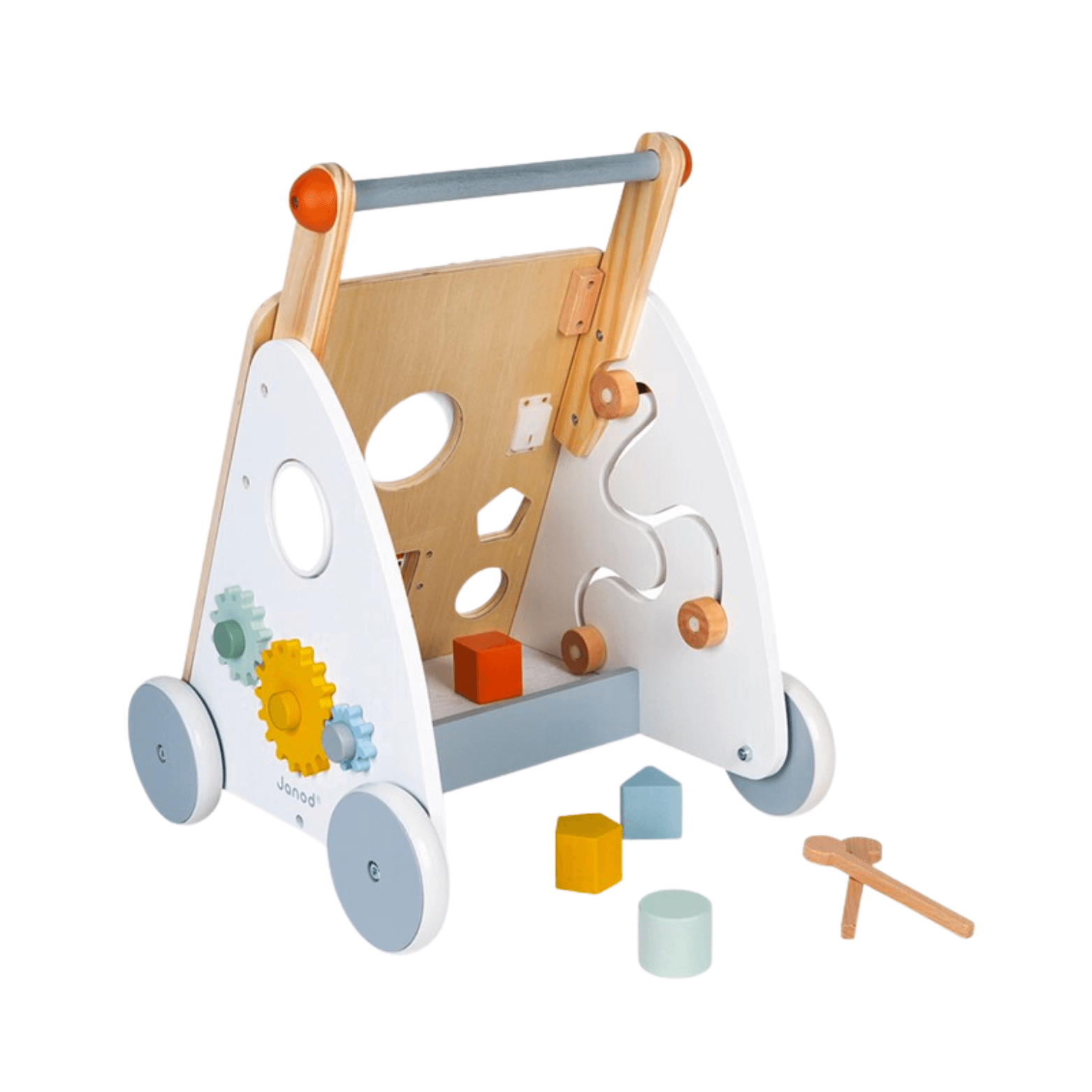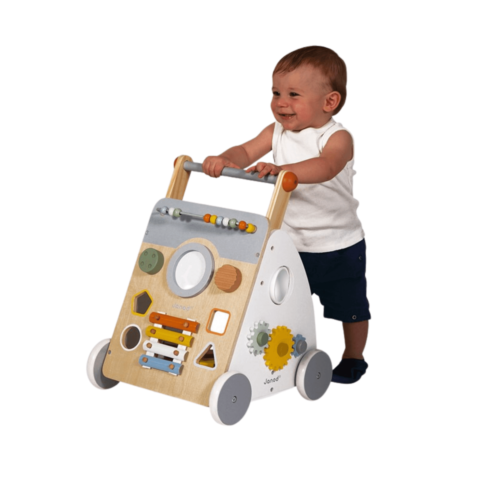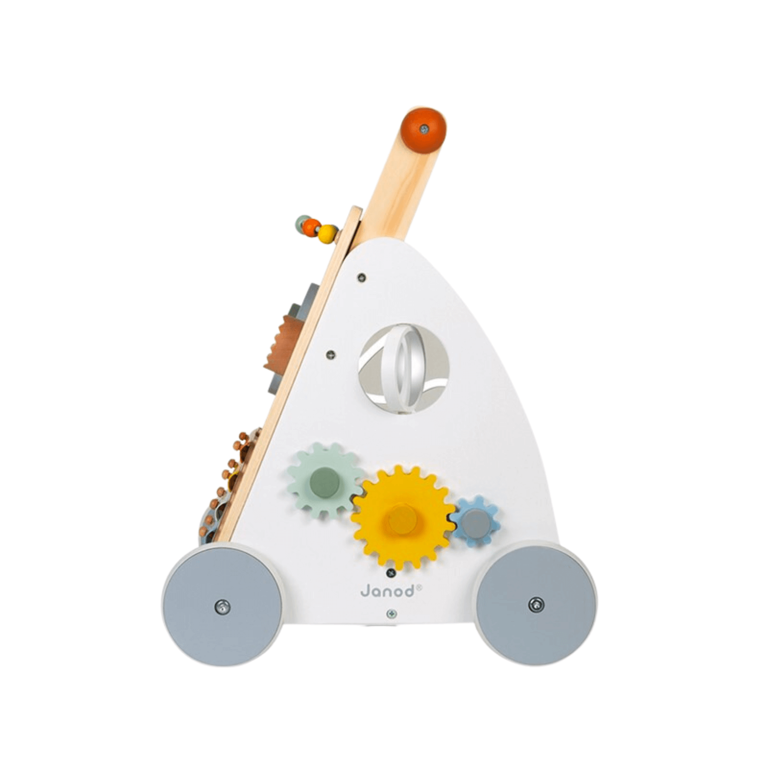 Nos encanta la madera natural, así como el blanco y el gris, destacados por los coloridos detalles de las numerosas actividades de este carrito de bebé para niñ@s pequeñ@s. Este caminador de colores suaves y formas redondeadas, acompaña al/la niñ@ progresivamente en sus primeros aprendizajes.
